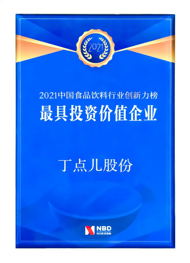 ? ? ? ?丁點兒股份成功獲得2021中國食品飲料行業(yè)創(chuàng)新力榜“最具投資價值企業(yè)”榮譽稱號。