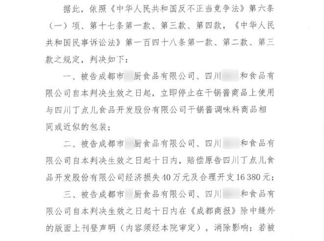 ? ? ? ?2020年11月30日,成都市中級人民法院一審判決丁點兒股份訴成都市某廚食品有限公司、四川某和食品有限公司不正當(dāng)競爭維權(quán)案勝訴。