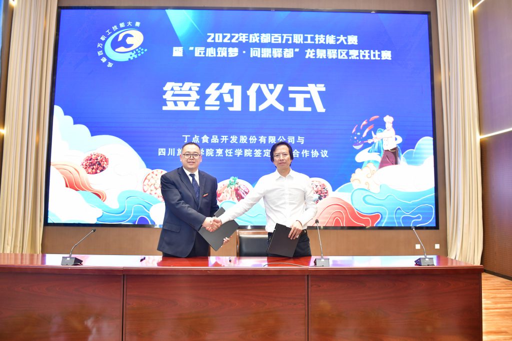 在龍泉驛區(qū)烹飪比賽閉幕式上,丁點兒股份董事長任康與四川旅游學院烹飪學院院長李想簽訂了校企合作協(xié)議并致詞。