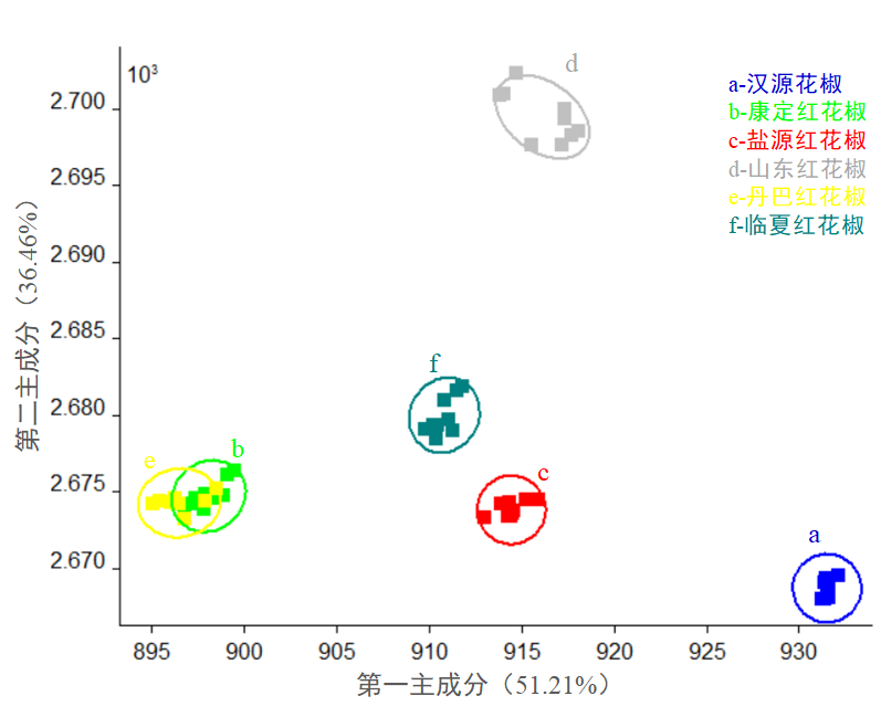 圖2:電子鼻傳感器對不同產(chǎn)地紅花椒響應數(shù)據(jù)的PCA 得分圖