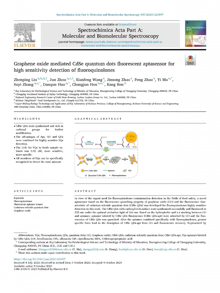 同樣是近日,由丁點(diǎn)兒股份董事長(zhǎng)任康和企業(yè)發(fā)展顧問(wèn)劉振平博士共同署名,與重慶大學(xué)等單位共同完成的基于量子點(diǎn)的創(chuàng)新技術(shù)成果《Graphene Oxide mediated CdSe quantum dots fluorescent aptasensor for high sensitivity detection of fluoroquinolones》(《氧化石墨烯介導(dǎo)的硒化鎘量子點(diǎn)熒光適配體傳感器對(duì)氟喹諾酮類抗生素的高靈敏檢測(cè)》【點(diǎn)擊跳轉(zhuǎn)原文】)在國(guó)際權(quán)威期刊(JCR Q1區(qū))《Spectrochimica Acta Part A Molecular and Biomolecular Spectroscopy》發(fā)表,國(guó)家發(fā)明專利也已公布并進(jìn)入實(shí)質(zhì)審查階段。