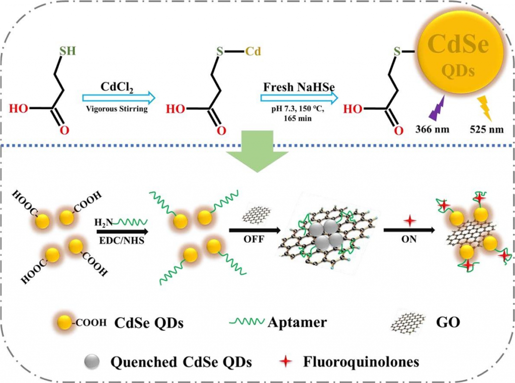 該項(xiàng)成果以3-巰基丙酸(MPA)為穩(wěn)定劑合成了表面易修飾、熒光性質(zhì)穩(wěn)定、水溶性良好的硒化鎘量子點(diǎn)(CdSe QDs),并將核酸適配體(Apt)的特異性識(shí)別功能、氧化石墨烯(GO)的表面特性和熒光猝滅性質(zhì)與CdSe QDs的特性融合在一起,構(gòu)建了GO介導(dǎo)的、基于CdSe QDs熒光標(biāo)記的適配體傳感體系用于動(dòng)物食品中氟喹諾酮類抗生素(FQs)殘留的高靈敏檢測(cè)方法,達(dá)到國(guó)際先進(jìn)水平。