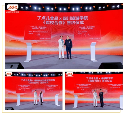 同時(shí)丁點(diǎn)兒食品與四川旅游學(xué)院、成都銀杏酒店管理學(xué)院、成都新東方高級(jí)技工學(xué)校進(jìn)行了《院校合作》簽約,通過不斷深化校企合作,助推川菜產(chǎn)業(yè)行穩(wěn)致遠(yuǎn)。四川旅游學(xué)院烹飪學(xué)院院長李想表示,通過科研項(xiàng)目、烹飪比賽等形式共同為川菜技能人才培養(yǎng)和高質(zhì)量發(fā)展作出貢獻(xiàn)。