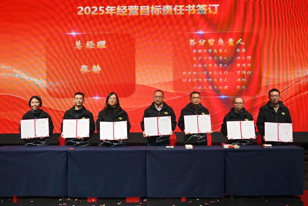 2024年,始終堅持公司利益第一,市場發(fā)展優(yōu)先的市場發(fā)展理念,丁點(diǎn)兒人上下一心,成功實現(xiàn)年度經(jīng)營目標(biāo)。2025年,踏上新的征程,任康董事長、張靜總經(jīng)理與各分管團(tuán)隊代表簽訂《2025年經(jīng)營目標(biāo)責(zé)任書》。