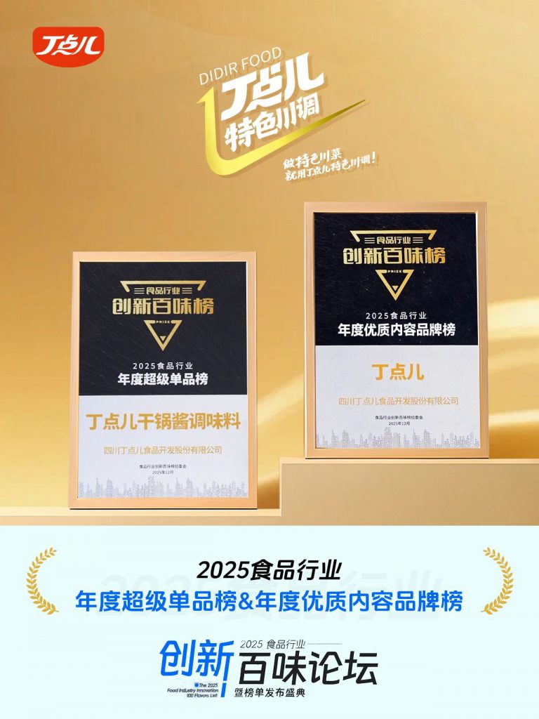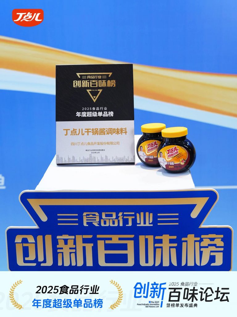 12月23日,在“共棲·2025食品行業(yè)創(chuàng)新百味論壇暨榜單發(fā)布盛典”上,丁點(diǎn)兒食品以明星產(chǎn)品干鍋醬及優(yōu)質(zhì)品牌內(nèi)容,成功摘得“年度超級(jí)單品榜”與“年度優(yōu)質(zhì)內(nèi)容品牌榜”雙項(xiàng)榮譽(yù),展現(xiàn)了企業(yè)在產(chǎn)品力與品牌影響力上的雙重實(shí)力。