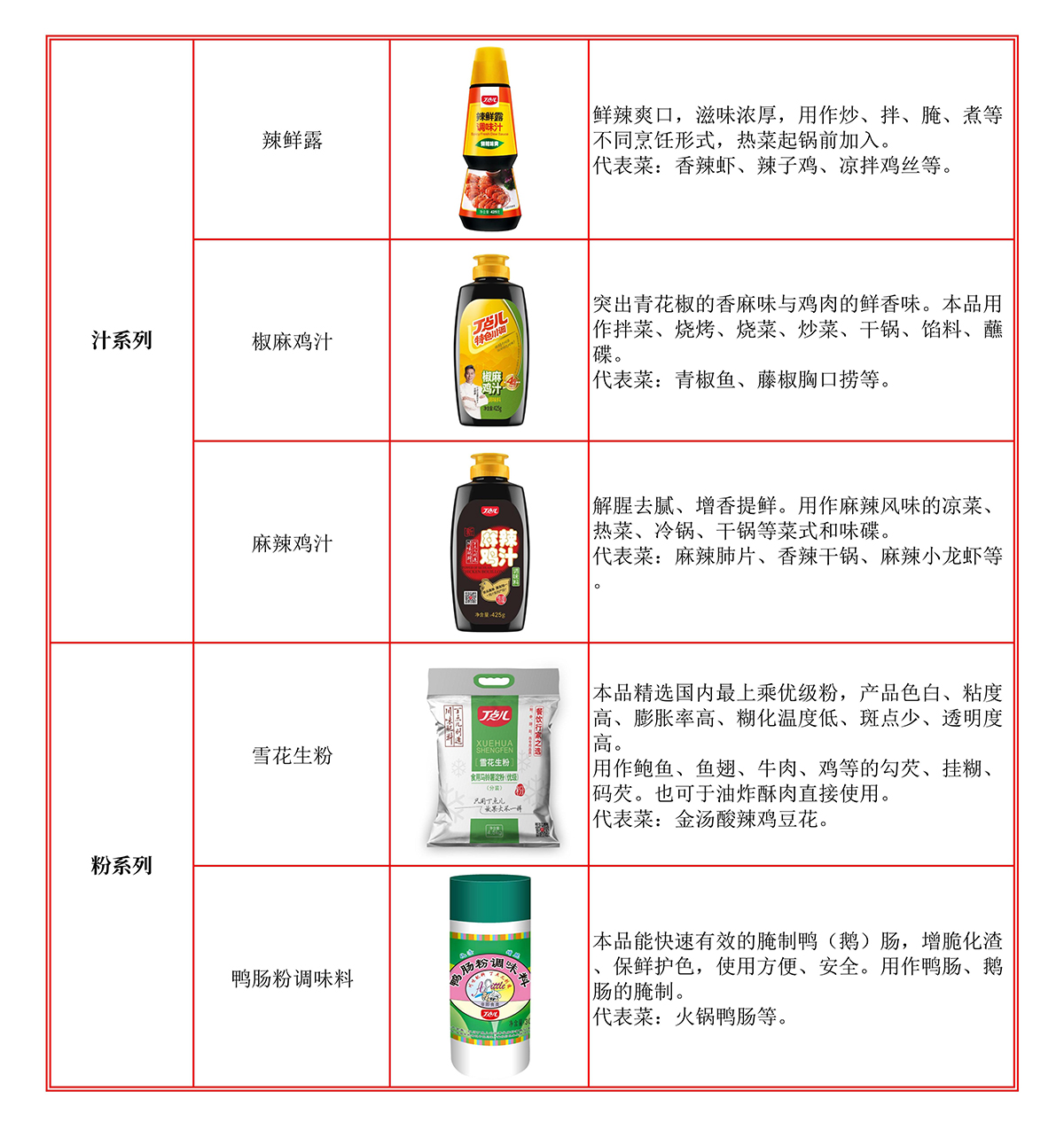 公司主要面向餐飲企業提供標準化、便捷化的川味特色調味料,主要有川味復合調味料、川味特色花椒油兩大類產品。川味復合調味料按形態劃分主要有醬、汁、粉、油四種形態;按口味劃分,圍繞川菜“麻”“辣”“香”的特點,主要有椒麻、麻辣、酸辣、鮮香等多種口味,共計200余種產品。川味特色花椒油主要有漢源紅花椒油、藤椒油等產品。主要產品如下: